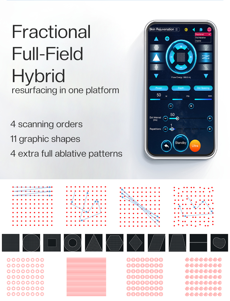 • Hybrid Mode: A versatile setting that combines both fractional and ablative actions, perfect for treating mixed scar types or sensitive areas with enhanced safety.