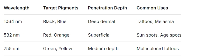 1064 nm: For deep penetration, ideal for black and blue pigments.