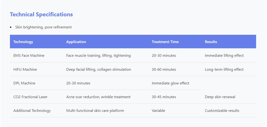 Transform your facial treatment offerings with our advanced 5-in-1 skin solution. This bundled package combines EMS, HIFU, DPL, CO2 Fractional Laser, and additional cutting-edge technologies to deliver comprehensive skin rejuvenation results. Ideal for beauty salons, medical clinics, and aesthetic centers seeking to offer complete facial treatment solutions